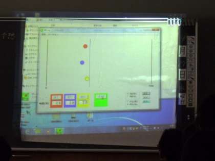パソコンソフトを使った3個のボールは、速さも動く距離も動いている時間も違います。その3個のボールの速さ比べです。下の写真では、どのボールが一番速いか分かってしまいますが、動いている状態では、判断がつけにくいです。