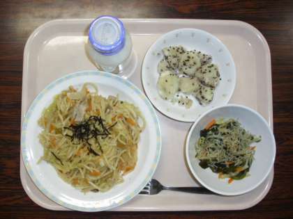 献立は、牛乳・和風スパゲティ・カリじゃこサラダ・ごまポテトです。