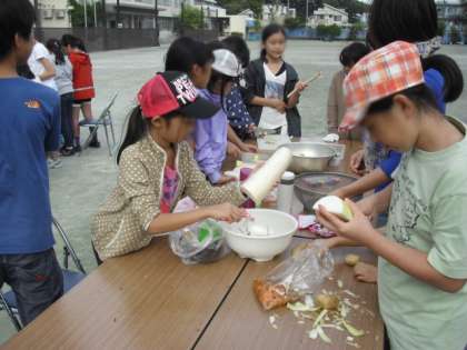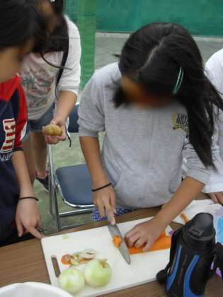 まずは、豚汁づくり。ネギ、ニンジン、タマネギ、ダイコン、ジャガイモ、ゴボウ、こんにゃく、油揚げ、肉などの材料を、班の仲間と分担して切っていました。みんな上手に包丁を使っていました。