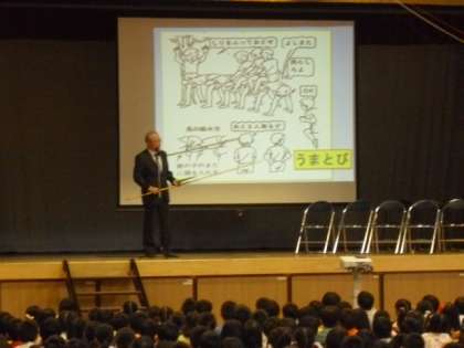 次にお話ししてくださったのは、学校関係者評価委員会委員長の與名本さんです。與名本さんは、ひがしの卒業生で大先輩です。ひがしが誕生した時に、深沢小学校から3年生として移って来られたそうです。当時の学校は、木造の校舎で、校庭は麦畑だったので、地面が波のようにうねっていて遊べなかったそうです。そのため、保護者の方々がうねの山をスコップで削ってくださり、体育授業はローラーを3人で引いて地面を平らにしたそうです。鉄棒などの遊び道具は全くなく唯一作っていただいた砂場で相撲をとっていたそうです。その他には、馬跳び、陣取りゲーム、三角ベース、けん玉、おはじき、お手玉などをしたそうです。
