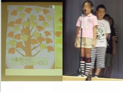 ひがしに対する一人ひとりの思いや願いを「葉」に書き、それをクラスごとに貼りました。テーマは、学年ごとに違います。