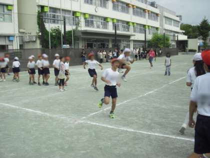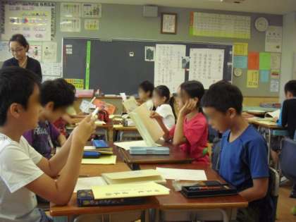 4年1組は体育(マット運動)、2組は教科「日本語」(漢詩)、3組は体育(長なわとび)