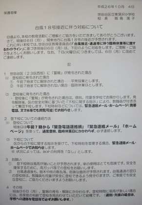 明後日10月6日(月)は、台風18号の接近が予想されています。これに伴い、世田谷区教育委員会の「台風接近・通過等に伴う臨時休業等に関するガイドライン」に基づいた対応について、子どもたちにお知らせを配布しました。ご確認をお願いします。