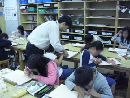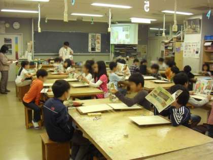 子どもたちは、先生の彫刻刀の使い方を見たり、説明を聞いたりしながら実際に版木を彫っていきました。みんな慎重に作業を進めました。最後には、ひらがなを彫ることに挑戦しました。先生が、子どもたちが活動しやすいよう細かく学習の準備をしてくださっていたので、安全に、そしてスムーズに活動を進めることができました。