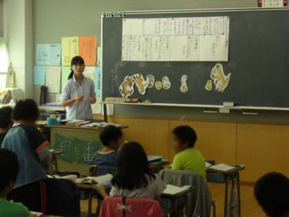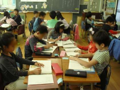 子どもたちはまず、これまでの学習を振り返りました。きつねや動物たちの気持ちをしっかりと読み取っていました。先生の用意したきつねたちの絵も、子どもたちが振り返りやすくしています。そして音読をするときのポイント「強弱」「気もち」「はやさ」などから自分たちが意識することを決め、グループごとに練習をしました。このお話の学習の最後に、発表会をする予定を聞き、とても意欲をもって取り組んでいました。