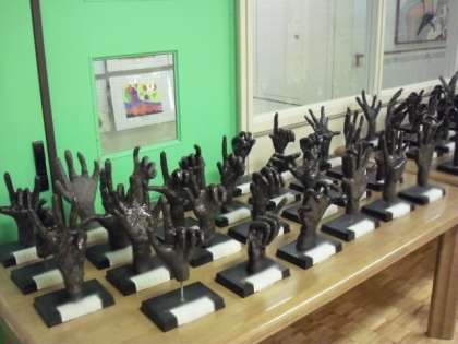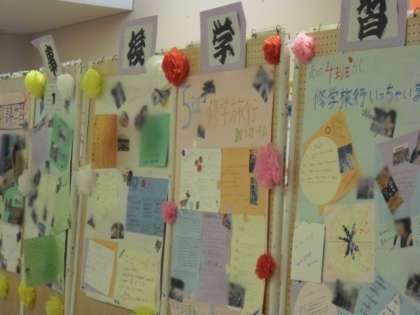 校内には、各学年の先輩たちによるさまざまな作品(職場体験新聞、修学旅行作品、英語科、社会科、I組の作品、部活動の作品……)が展示されていました。