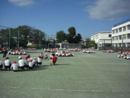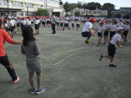スタート前に、しいんとなる全校の子どもたちからやる気がひしひしと伝わってきました。そして5分間の挑戦です。校庭中に「ハイ、ハイ…」の声が響きました。
