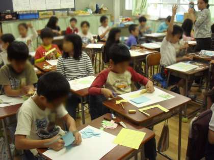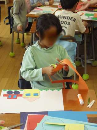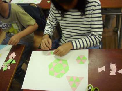 1年生と3年生が算数の学習で、図形を使って、絵や模様をつくっていました。