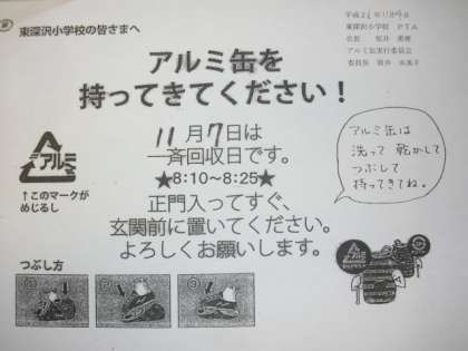明日の朝は、アルミ缶実行委員会によるアルミ缶回収日です。ご協力をよろしくお願いします。