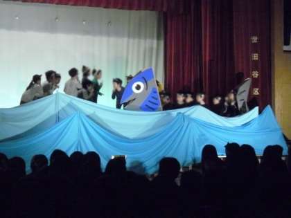 「11ぴきのねこ」は2年生。腹ぺこの野良ねこたちが、大きな魚を捕まえに出発します。どの役も、元気な2年生にぴったりです。盛り上がること請け合いです。