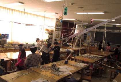 12月3日にもお知らせした、「長ーい紙、つくって」の他のクラスの授業の様子です。今回のクラスは教室を囲むようにチームで活動する様子が多く見られました。