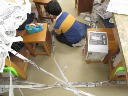 チームで大きく活動するので、広さを求めて廊下でも活動したいと自分たちから許可を求めに来ました。また、個人の活動も充実し、床面に長い紙を配置していく様子も見られ、素材の新聞紙との関わり合いも充実していました。