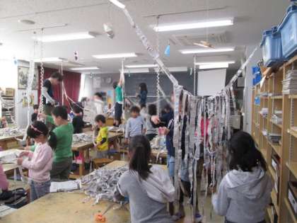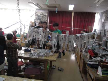 今日のクラスの特色は、つないだ紙に新たな紙をぶら下げていく活動が多いということです。写真を見ていただくとお分かりいただけますが、帯状につなげる活動だけではなく、帯状につないだ紙に暖簾のようにぶら下げているわけです。