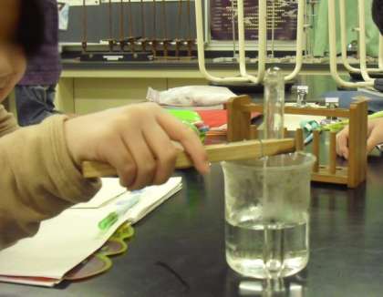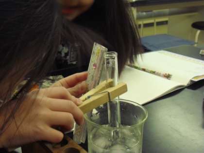 まず石けん水の膜を試験管に作り、試験管をお湯で温めると「膨らんだ!!」。そして氷水で冷やすと「へこんだ!!」。