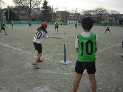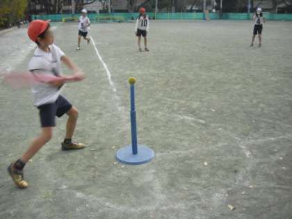 体育の学習で、野球型の運動としてティーボールに5年生が取り組んでいました。気軽にバッティングを楽しむことができるよう方法やルールも野球とは違います。
