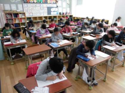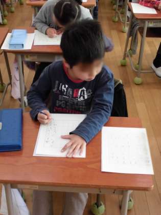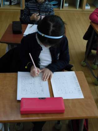 写真は1年生の様子です。低学年は鉛筆で書きます。どの子も集中しており、とてもよい姿勢で感心しました。きれいに書けた文字を見て、とてもうれしそうにしている子もいました。
