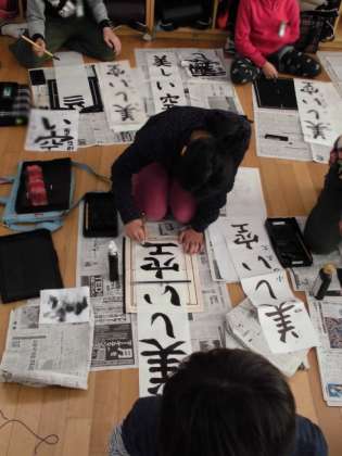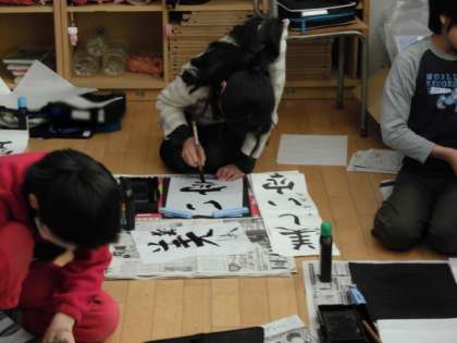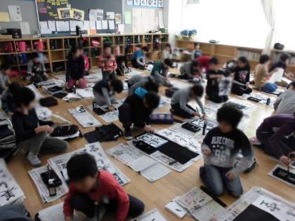 写真は4年生の様子です。3・4年生は、教室で取り組みました。お互いに見合ってうまく書けたところを認め合っていました。体育館とは違って少々狭いのですが、暖房のきく見慣れた教室ですので、筆をしっかりと持って、いつも通りの力を発揮することができました。
