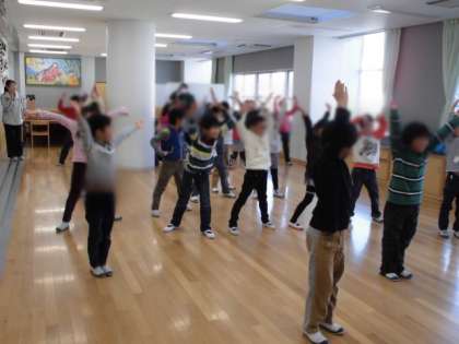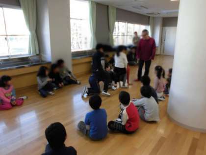 2年生は、まず「だるまさんが転んだ」を変形した遊びを楽しみました。リーダーの言葉に合わせて、あるものに成り切ります。