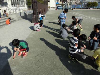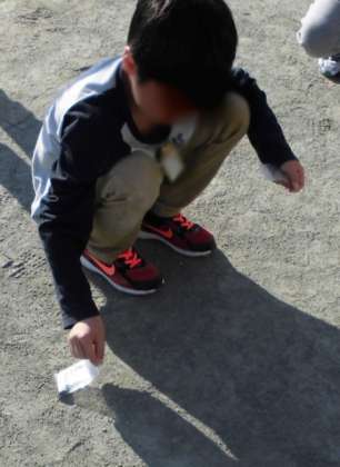 理科で「じしゃくのひみつ」を学習している3年生が、校庭で砂鉄集めをしていました。