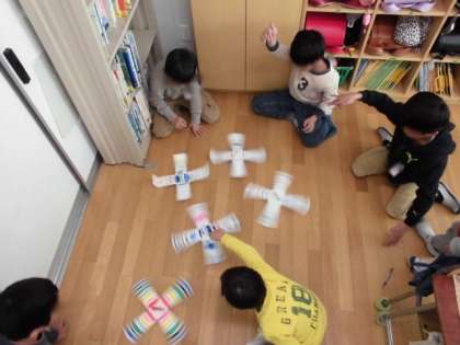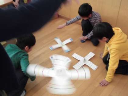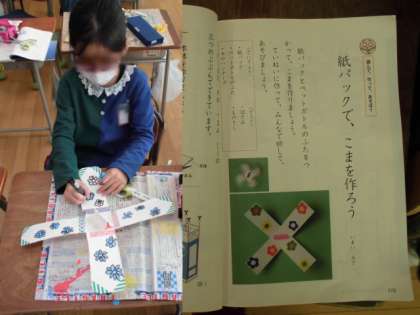 教科書の文章を読み取り、実際に紙パックを使ってこまを作りました。教科書をきちっと読み取れなければ、うまく作れません。みんな、しっかりと学習を進めました。