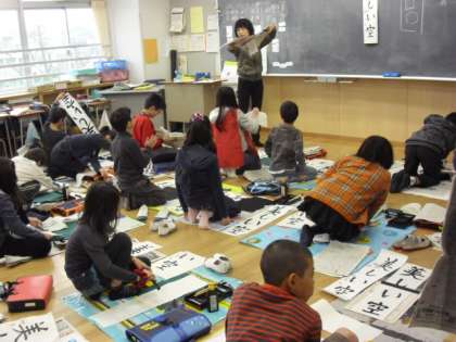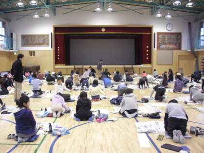 体育館では5年生が、教室では4年生が書き初めをしました。体育館でも、教室でも、シーンと静まり返り、子どもたちが真剣に書き初めをしていました。