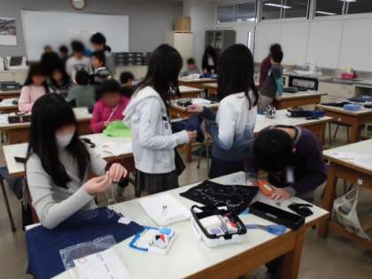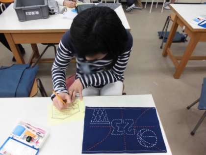 5年生の家庭科です。思い思いのデザインの刺繍は手で、周りはミシンで縫っていました。手際良く作業を進めていました。これまでの学習の積み重ねを活かしています。ぜひ、給食や家で使ってほしいと思います。