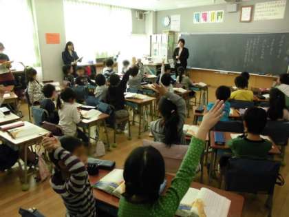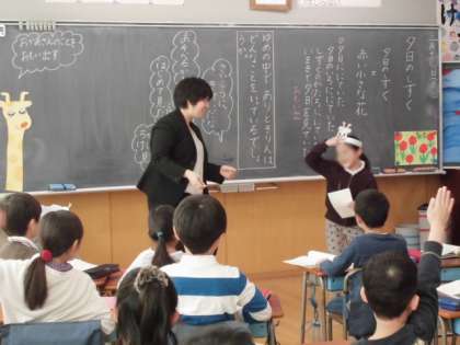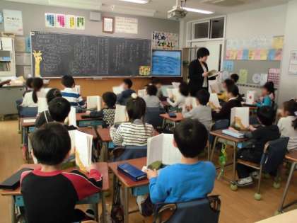 3校時は、1年生担任の初任者教員の研究授業で、国語「夕日のしずく」でした。お話に登場する「あり」と「きりん」の気持ちを想像する学習でした。