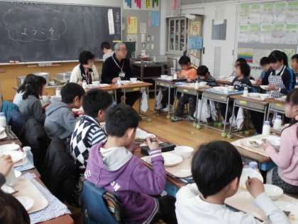 「給食は、とてもおいしかった」「子どもたちと一緒に食べられてとても楽しかった」とおっしゃっていただきました。