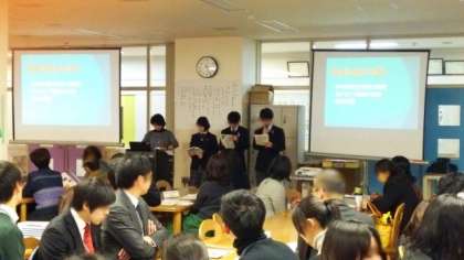児童生徒交流・特別活動分科会の取り組みは、中学校生徒会の生徒が発表しました。小学校の児童会をリードし、募金活動、合同あいさつ運動、合唱交流等の活動を進めました。立派な「先輩たち」に成長しています。