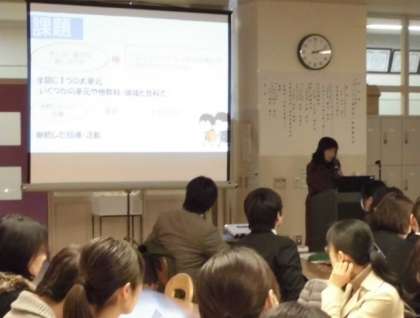 まず、研究・研修分科会は、今年度各校が取り組んだ保健体育、国語、算数の研究について報告しました。3校とも、成果と課題を得ています。そして、生活指導分科会は、「みしまの森 六箇条」の共通した指導や、「あいさつ運動」について報告しました。今年度は、等々力小と東深沢小が、共通した「あいさつカード」を活用しました。