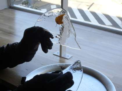 氷の中に落ち葉が一枚、美しい発見です。