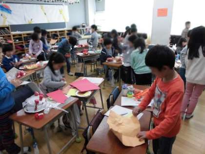 作るポイントは紙をくしゃくしゃに丸めたり、丸めた物を色画用紙で包んだりして立体感を出すことです。