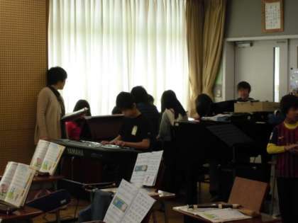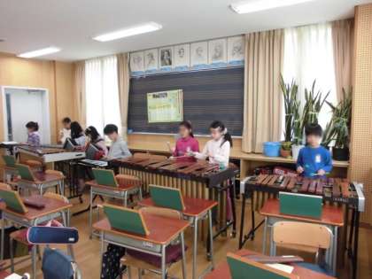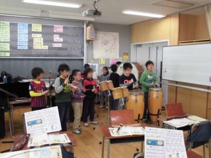 3年生が、「山のポルカ」を合奏していました。他の学年と同じように自分が選んだ楽器を使っています。使う楽器が重なっていることもあるので、交代しながら合奏し、自分が演奏することとともに、みんなで音を合わせることも楽しんでいました。学年を重ねるごとに、自分たちで活動する力もつき、技能も上達していきます。