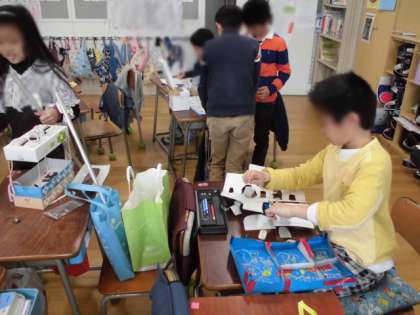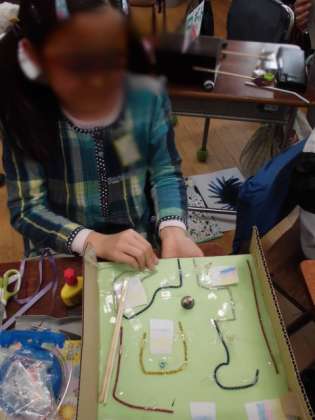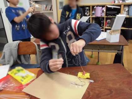 これまでの学習で使った磁石や、豆電球、乾電池などを使っておもちゃ作りをしていました。