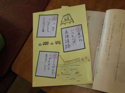 3年生は、社会科で世田谷区について学習してきました。地形、交通、産業、文化など、様々な内容です。その世田谷区の特徴を俳句のリズムで表していました。子どもたちが考える参考になるよう、お隣のクラスの作品を借りてきて、その中から「おすすめの一句」を選んで(今回の写真です)から、自分たちもつくり始めました。