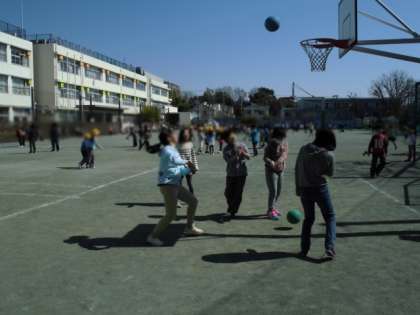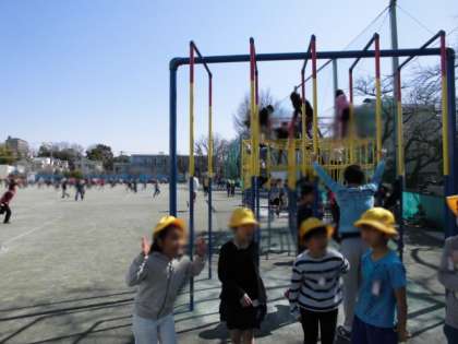 風は冷たかったですが、日差しはもう春です。大勢の子どもたちが、思い思いの遊びを楽しんでいました。元気な子どもたちで校庭がいっぱいでした。