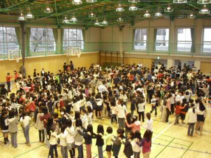 今朝は、集会委員会による「じゃんけん列車」です。まずは、違う学年の子とじゃんけんをして、負けた人が勝った人の後ろについていきます。どんどん列が長くなって、最後まで先頭の人がチャンピオンです。こんな、今日の集会で新しい友達ができたかな。友だちとのかかわりを増やすゲームでした。