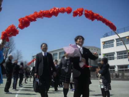 好天に恵まれ、校庭で歓送式を行いました。卒業生と保護者の皆さんは、花のアーチをくぐりながら、様々な思い出がよみがえったことと思います。そして、玄関や校庭では、別れを惜しんで、記念撮影をする卒業生と保護者でいっぱいでした。