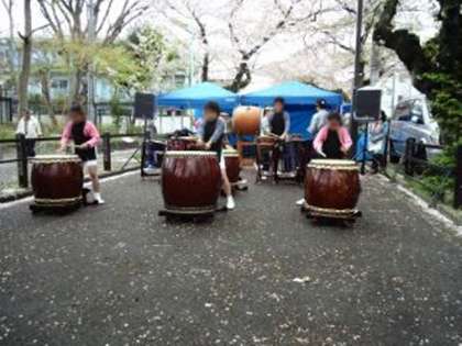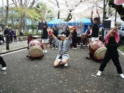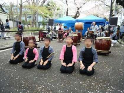 桜の舞い散る緑道の会場では、和太鼓チーム「こざくら(子ども)」と「鼓桜(大人)」の演奏がありました。こざくらには、ひがしを卒業した先輩たちも参加していました。