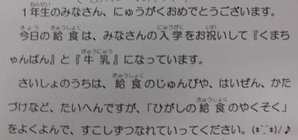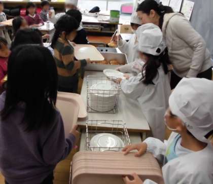 今日は1年生にとって、初めての給食でした。給食当番は、先生の話をよく聞いて配膳していました。