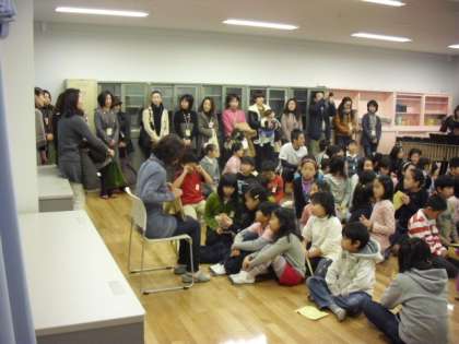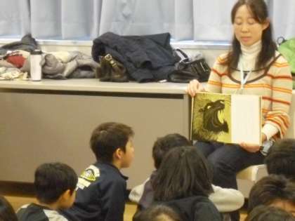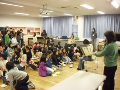 今回は、「かたあしだちょうのエルフ」の読み聞かせです。マリンバの生演奏とお母様のしっとりとした声に、子どもたちは思わず前のめり。