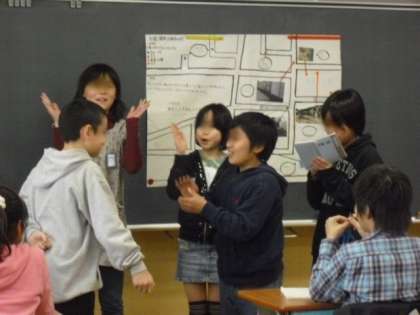 2学期に事前学習で「入りやすく見えにくい所」を学び、フィールドワークを行い、地図の形にまとめて、今日の発表会です。