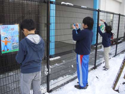 今日は、校舎の周りのフェンスに自分たちで作ったポスターを掲示しました。