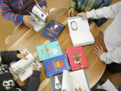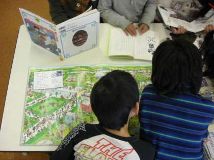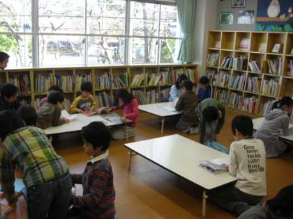 2年生が、絵本の部屋で読書をしています。絵本の部屋は、校舎耐震補強工事で新しくなった校舎に作られた部屋です。床に座って、大きな絵本やお気に入りの絵本を読んでいます。外は、冷たい空気ですが、絵本の部屋は暖かな雰囲気で、子どもたちも嬉しそうです。