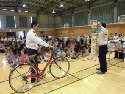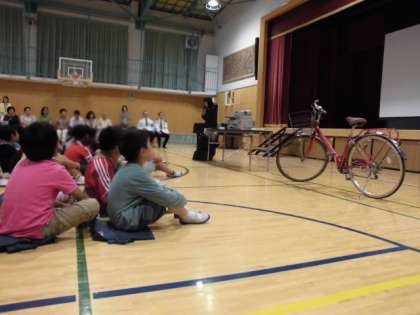 校庭で実施を予定していた交通安全自転車教室ですが、雨のために残念ながら体育館での実施となりました。