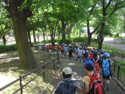 天候に恵まれ、たくさん汗をかきながら、1、2年生合同のグループで遊びました。