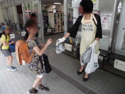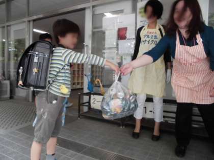 今日はアルミ缶回収日です。アルミ缶を持って登校する児童が、見られました。