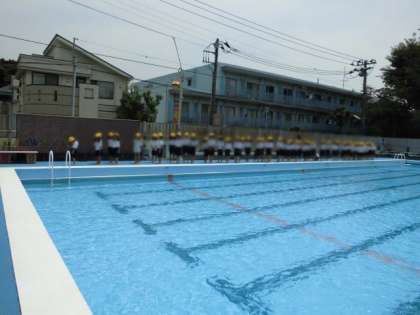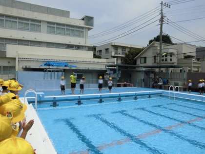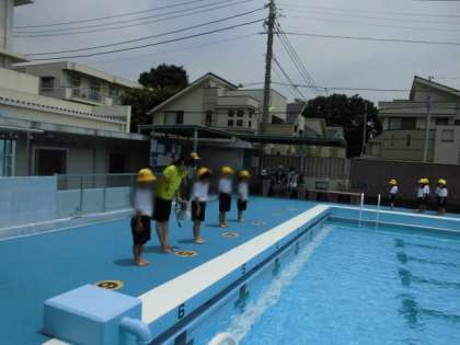 今日は水には入らずに、プールの施設説明や、プールでの並び方を確認しました。