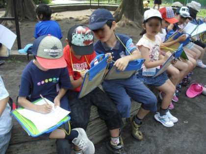 三島公園に着いてからは、歩いてきた間に発見したものを思い出しながら書いていました。15個以上書けている児童もいました。