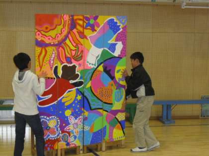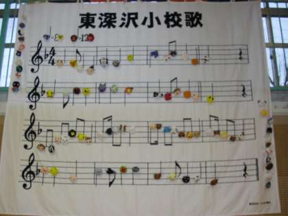 体育館には、校歌のタペストリーも飾ってあります。体育館入口の折り紙の校章は、20分のひみつで折った折り紙を張った大作です。2階の中央階段から体育館入口に続く廊下には、昔の写真等も掲示してあります。